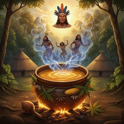 • Renovação e Ciclos: O Cauim era frequentemente consumido em rituais de passagem, como a iniciação dos jovens, ou em festas de colheita. Isso o conecta ao simbolismo dos ciclos de vida, abundância e renovação da natureza, celebrando a capacidade de sustento da terra e a continuidade do grupo.