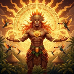 Em muitas lendas, Guaraci é visto como um ser poderoso, por vezes filho de Tupã, o deus supremo e criador, ou, em outras versões, amante de Jaci, a deusa da Lua e guardiã da noite. Essa dualidade entre Sol e Lua (Guaraci e Jaci) é um dos simbolismos mais universais e poderosos. Representa o equilíbrio cósmico entre o Dia e a Noite, o Macho e a Fêmea, o Fogo e a Água. A história deles, que só se encontram nos breves e mágicos momentos da aurora e do pôr do Sol, evoca a eterna busca pela união dos opostos, um tema central em toda a mitologia humana.