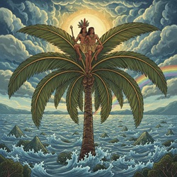 Enquanto as águas subiam, Tamandaré e sua esposa buscaram refúgio no topo de uma palmeira, uma Pindo1. Na simbologia universal, a árvore é o Axis Mundi2, ou o eixo do mundo, que liga a terra ao céu. A palmeira, especificamente, representa a resiliência e a vitória, pois é uma árvore que se dobra mas não quebra, mantendo sua copa sempre voltada para a luz. Ao se abrigarem nela, o casal torna-se o elo entre o mundo que se foi e o mundo que viria a existir.